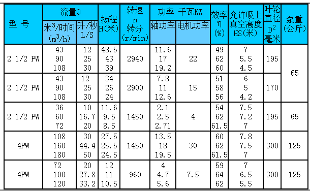 21/2PW 21/2一泵吐出口口徑為2'/2寸,即65毫米 P-雜質(zhì)泵 W-污水